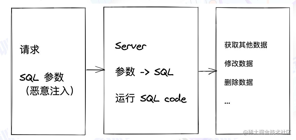 当用户输入用户名为 any; DROP TABLE table 时,数据库会执行 SELECT * FROM users WHERE username=' any; DROP TABLE table',从而造成删库